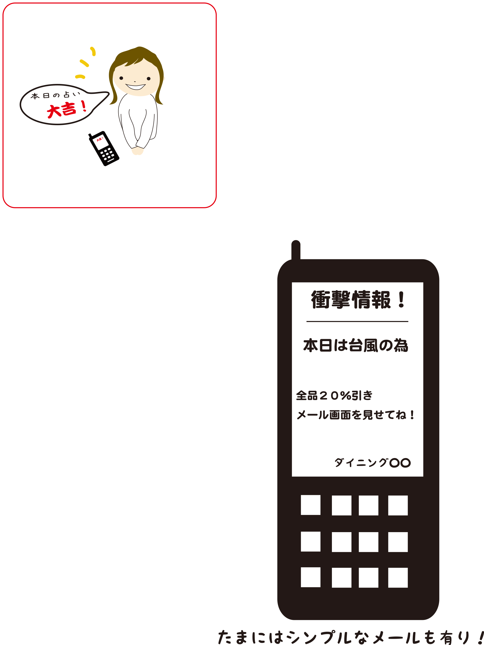 例えば、「衝撃情報」としてゲリラ的に激安クーポンを配るとか、思いっきりシンプルなメールで、